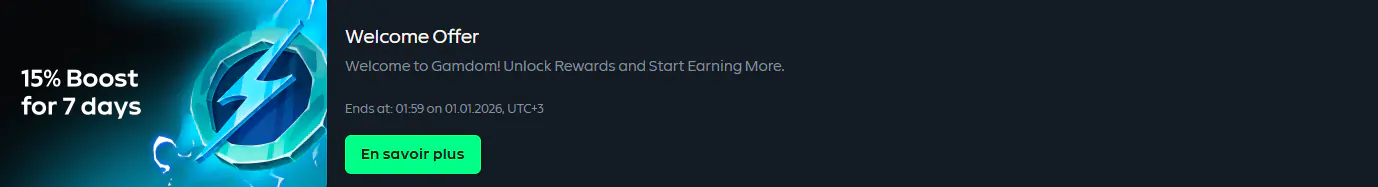 Le week-end, place à l’adrénaline ! Le Gamdom Weekend Boost combine cash et tours gratuits pour un maximum de divertissement. Cette promo Gamdom est pensée comme un grand événement : idéale pour prolonger vos sessions de paris sportifs, explorer de nouveaux jeux live, ou simplement profiter de vos tours gratuits sur vos machines à sous préférées. Saisissez votre code promo Gamdom pour activer cette offre exclusive et profitez de la meilleure expérience mobile du marché, directement depuis votre smartphone ou votre tablette.