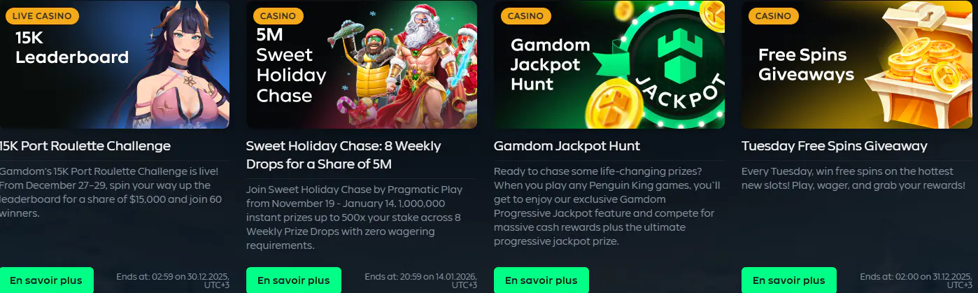 Bienvenue sur la page officielle des offres Gamdom, où chaque joueur découvre une expérience de récompenses exceptionnelle. Sur Gamdom Casino, nous avons imaginé une suite complète de promotions, conçues pour célébrer votre passion du jeu et rendre chaque session plus palpitante. Notre plateforme en ligne vous propose des bonus, des tours gratuits, des codes promotionnels et des avantages sur mesure pour tous les profils : des nouveaux inscrits jusqu’aux membres VIP les plus fidèles. Avec casino Gamdom, le plaisir, la sécurité et la transparence sont au cœur de chaque promotion Gamdom.