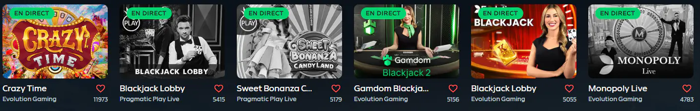 Le Live Casino de Gamdom vous plonge dans une ambiance de casino terrestre sans quitter votre domicile. Grâce à la diffusion live en haute définition, nos jeux en direct réunissent authenticité et interactivité. Vous pouvez échanger avec les croupiers en temps réel, ajuster vos mises, et profiter d’un environnement VIP où chaque détail compte. Cette section inclut des jeux populaires comme la roulette, le blackjack, le baccarat et le poker. Les tables sont animées par des professionnels expérimentés, garantissant la fair-play et la sécurité des transactions. Pour ceux qui recherchent l’émotion d’un vrai casino en ligne, le Live Casino Gamdom est la référence.
